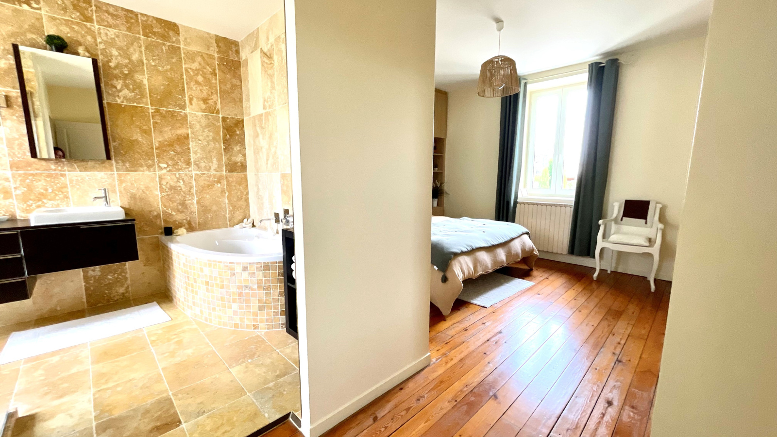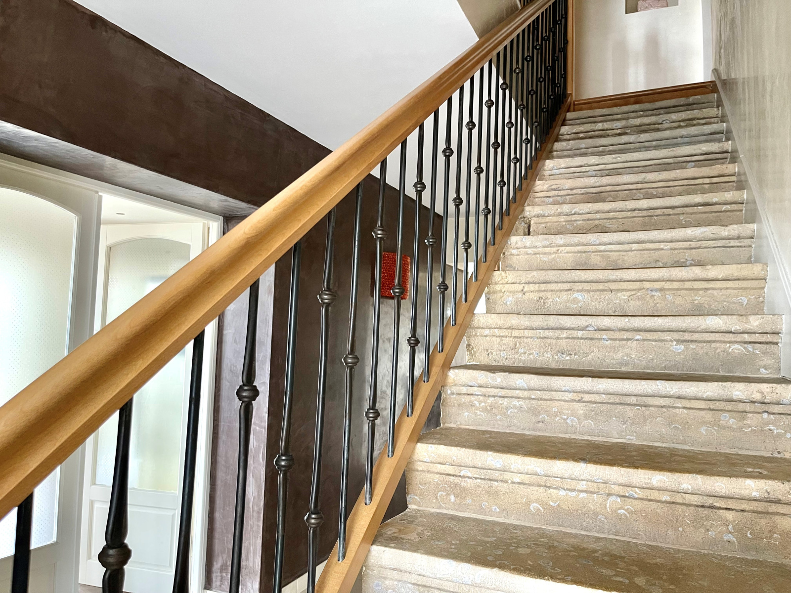 Un bel escalier en pierre mène au premier étage et dessert une suite parent (25m²) avec sa salle de bains (baignoire et douche à l’italienne) dressing, une chambre (16m²) avec salle de douche, une 3ème chambre (13m²), toilette. Bureau/studio de 29m² placards aménagés, wc séparé avec accès indépendant.