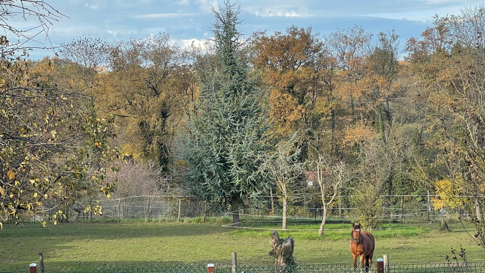 Charmant jardin plat, clos, arboré (figuiers, pins..), offrant une vue dégagée sur les Monts du Lyonnais. Terrain constructible.